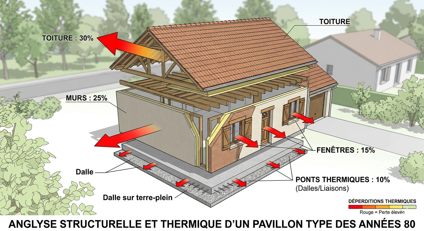 Avant de transformer votre maison, il faut comprendre ses faiblesses. Les pavillons du Beauvaisis construits entre 1970 et 1990 sont structurellement robustes grâce au parpaing et aux charpentes saines, mais ils restent thermiquement obsolètes. Le diagnostic thermique actuel révèle des fuites massives qui pèsent sur votre budget.