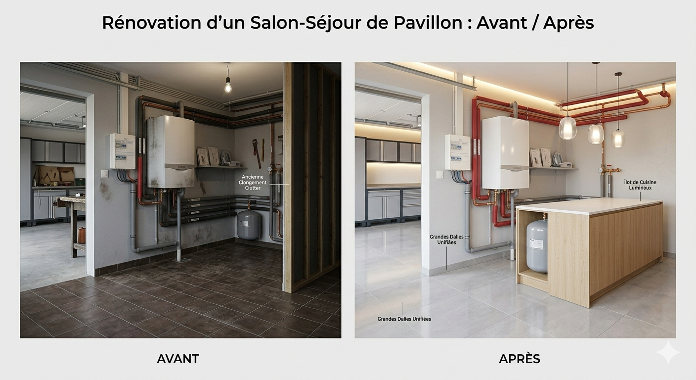 Si vous habitez un pavillon à Bresles ou Noailles, vous avez probablement cette configuration : une entrée desservant un couloir étroit, une cuisine fermée "laboratoire" et un séjour en "L" avec une cheminée à foyer ouvert au centre. Cette compartimentation, pensée pour garder la chaleur dans des pièces précises, est à l'opposé des modes de vie actuels qui privilégient la circulation de la lumière et la convivialité.